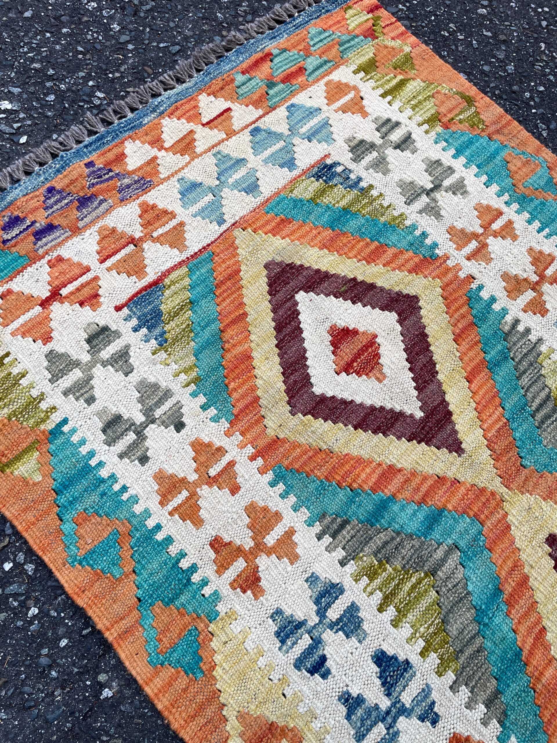 Add energy and artisan craftsmanship to your space with this authentic Afghan Kilim runner, handwoven from 100% natural wool using traditional flatweave techniques. This piece showcases a rich tribal diamond motif running through the center, framed by bold, colorful borders in red, yellow, turquoise, green, and soft pastels.