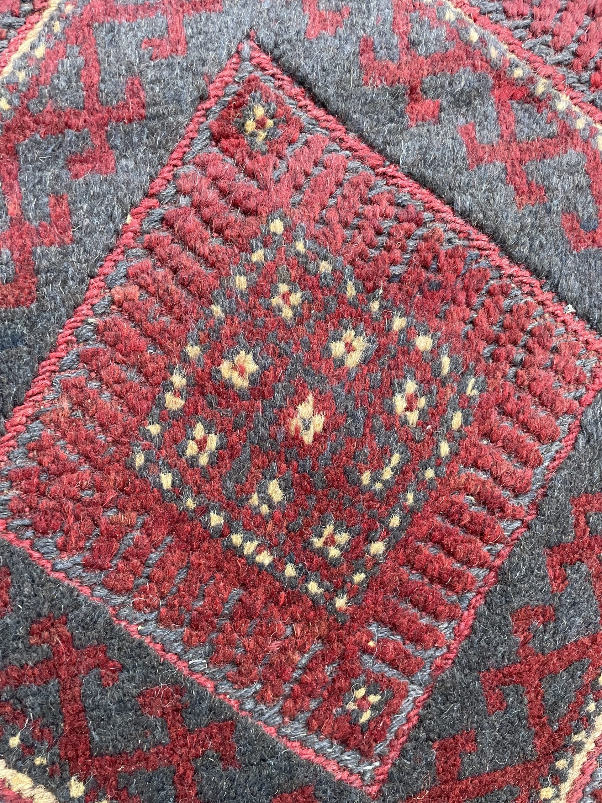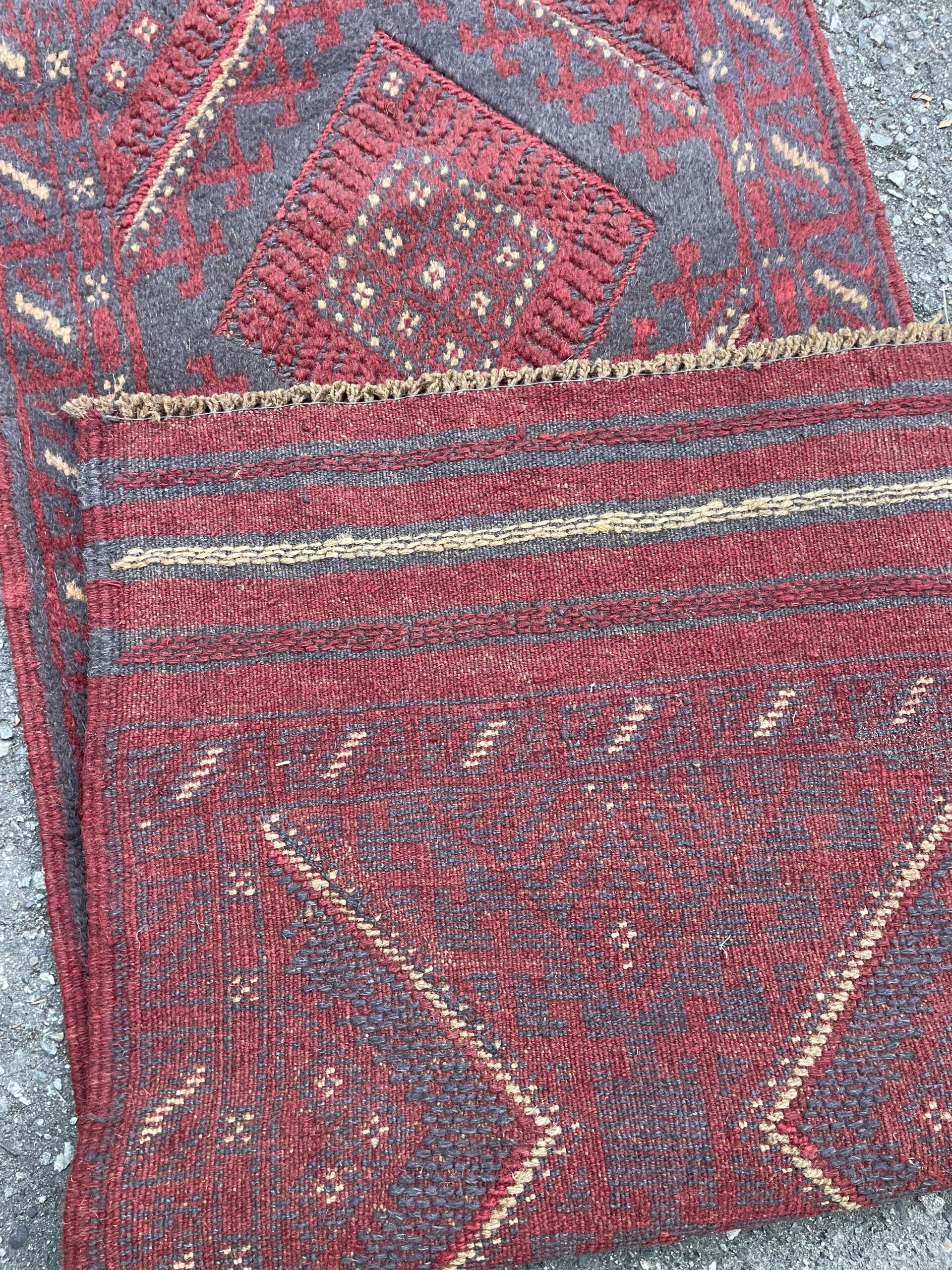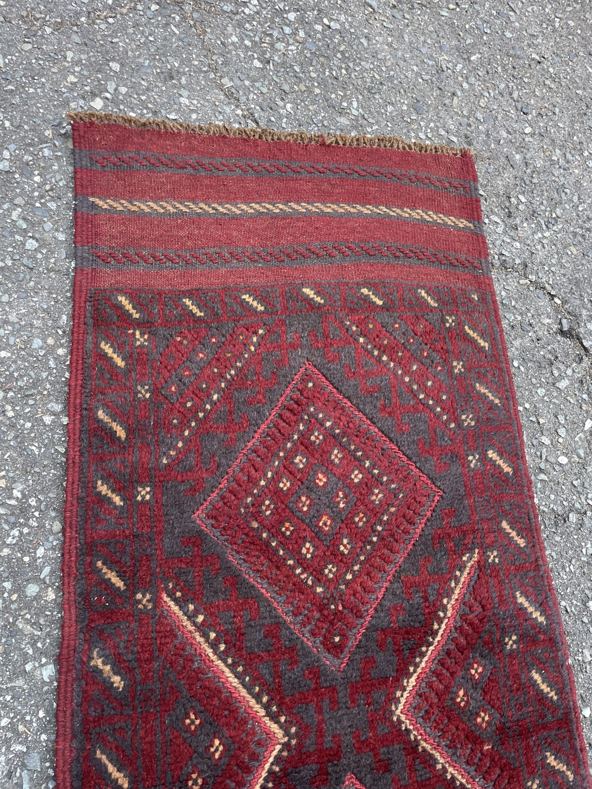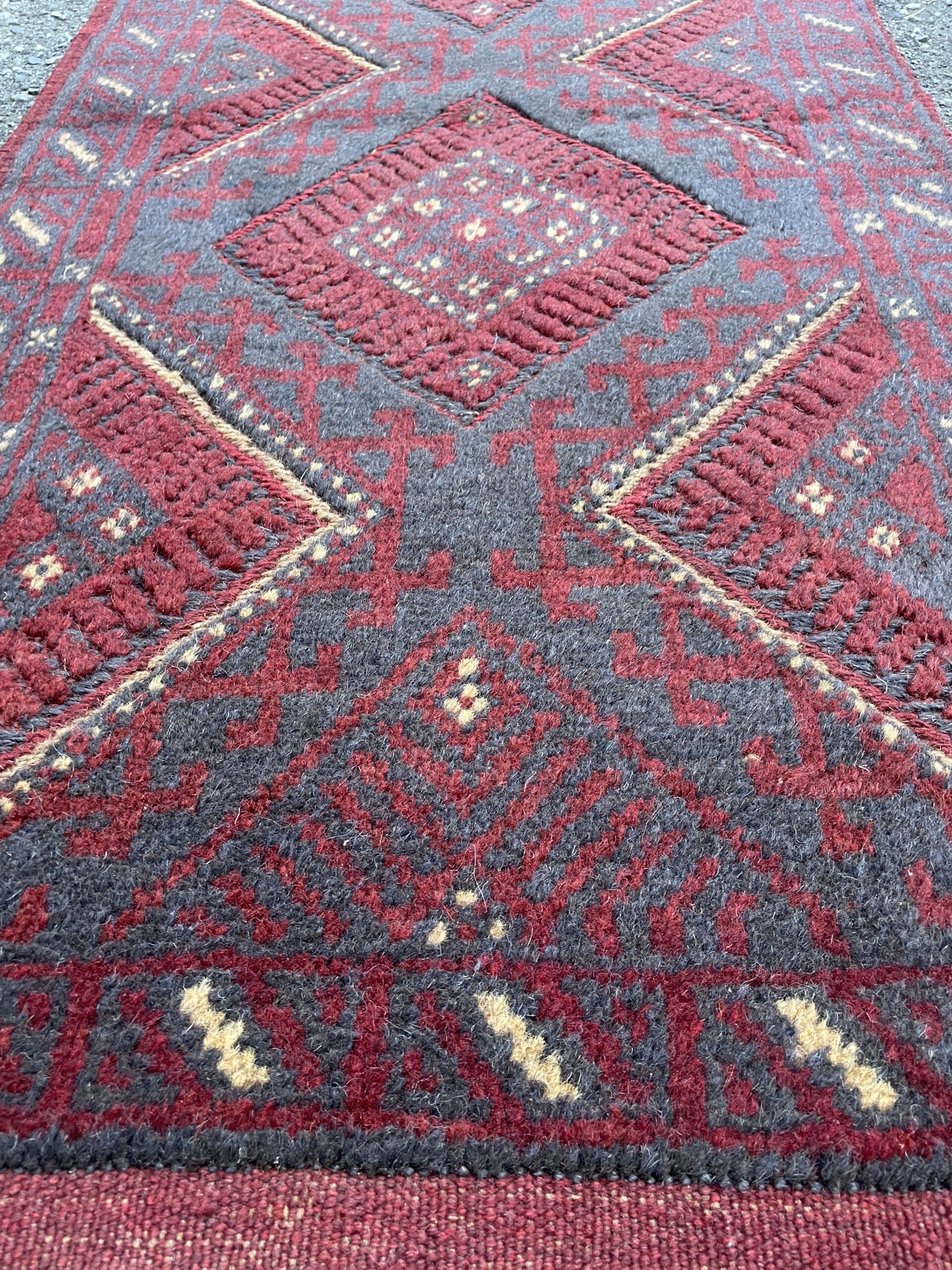 A beautiful Afghan wool runner featuring bold diamond medallions in deep reds and indigo, with rich tribal borders. Hand-knotted and one-of-a-kind—perfect for hallways or entryways.