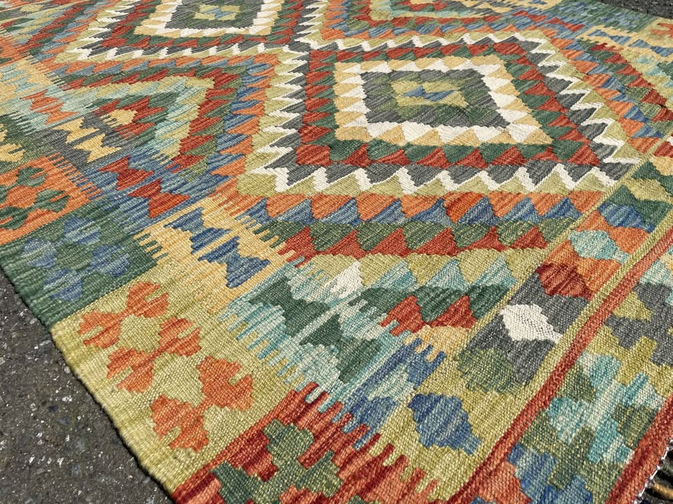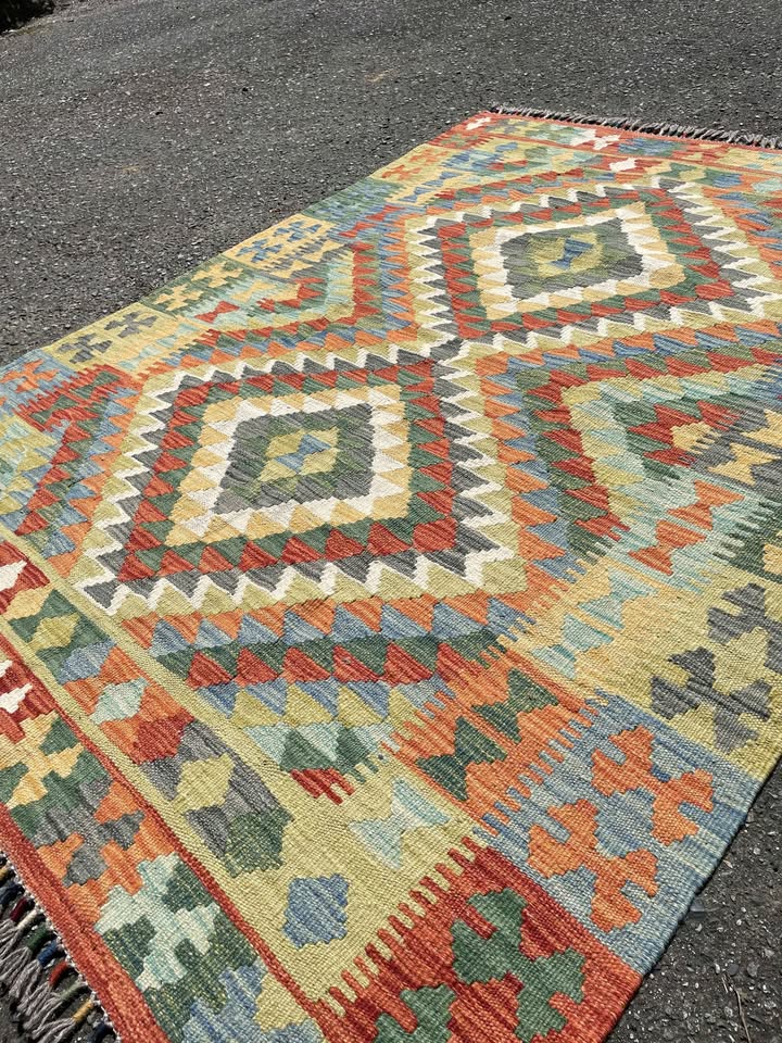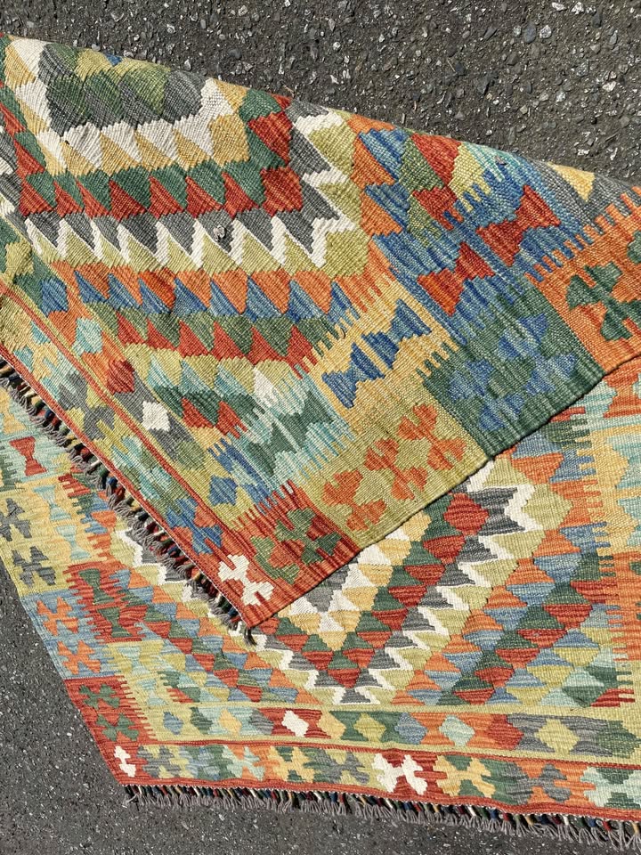 Authentic handwoven Kilim rug from Afghanistan. Made with natural wool and dyes, each piece is unique with bold, tribal patterns. Lightweight, reversible, and full of character?perfect for adding warmth and texture to any space.