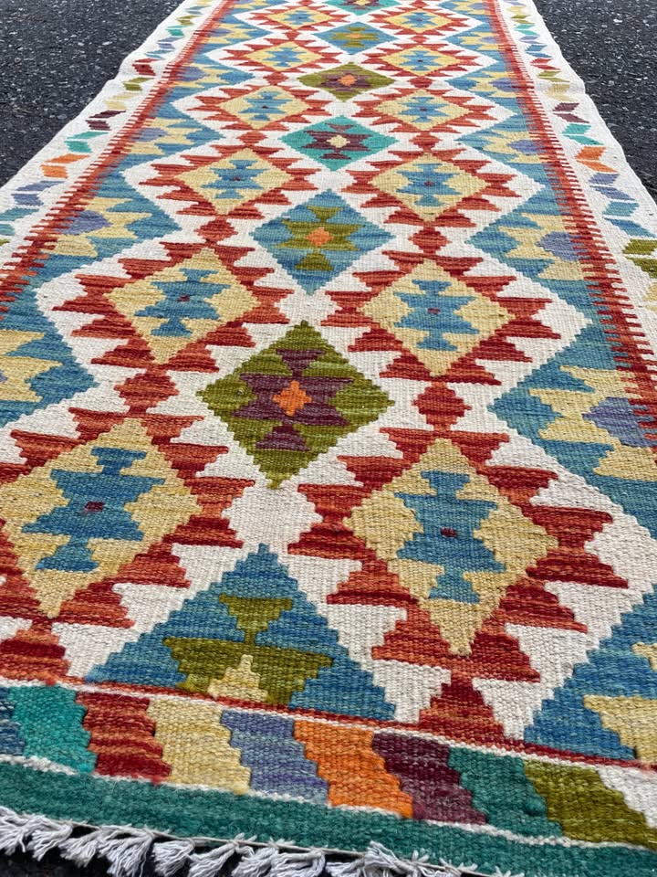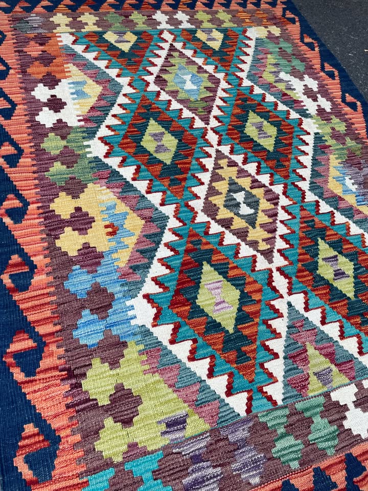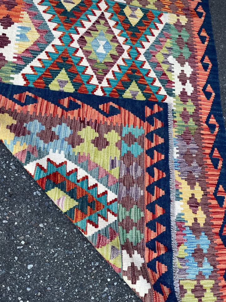 Authentic handwoven Kilim rug from Afghanistan. Made with natural wool and dyes, each piece is unique with bold, tribal patterns. Lightweight, reversible, and full of character?perfect for adding warmth and texture to any space.